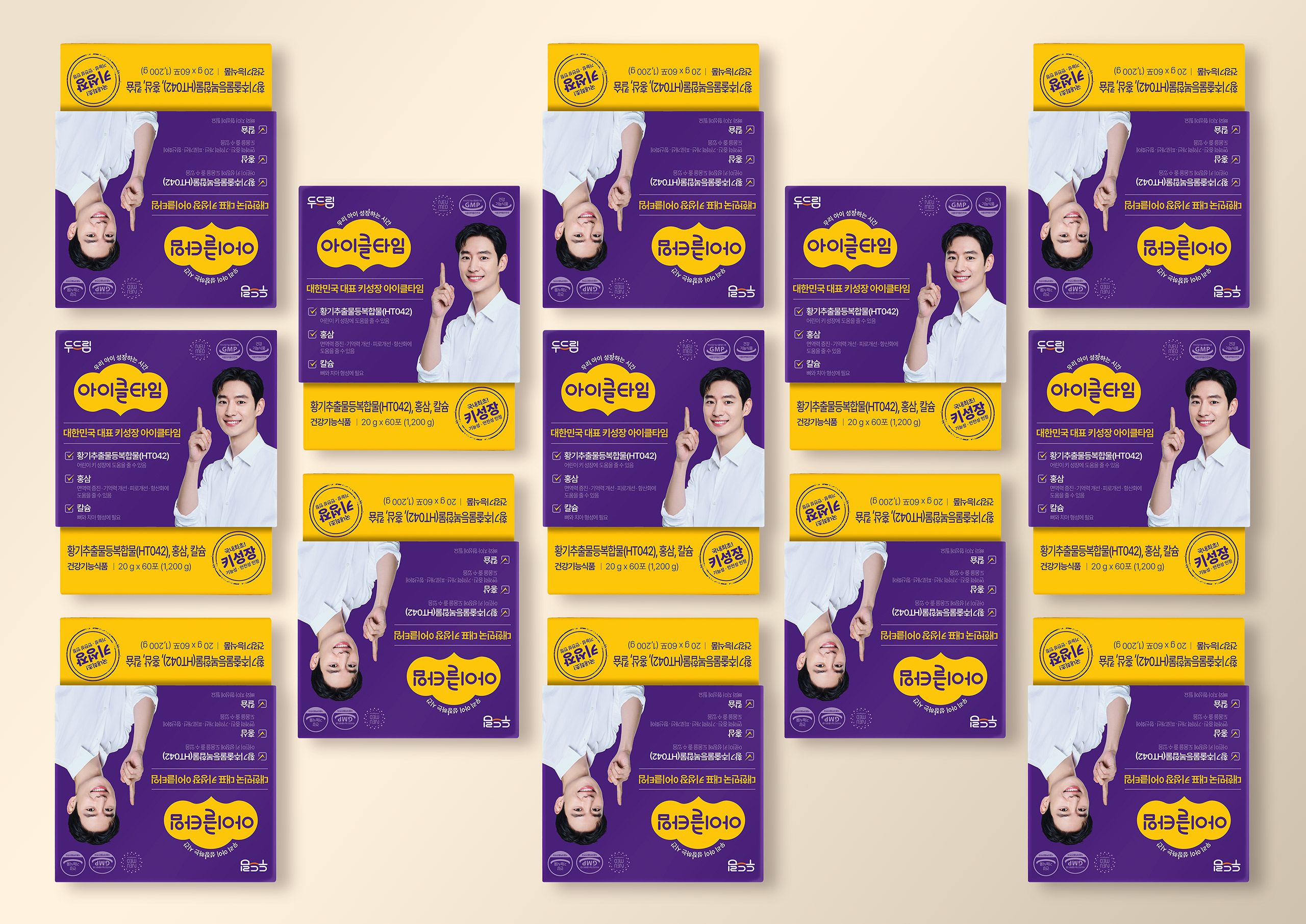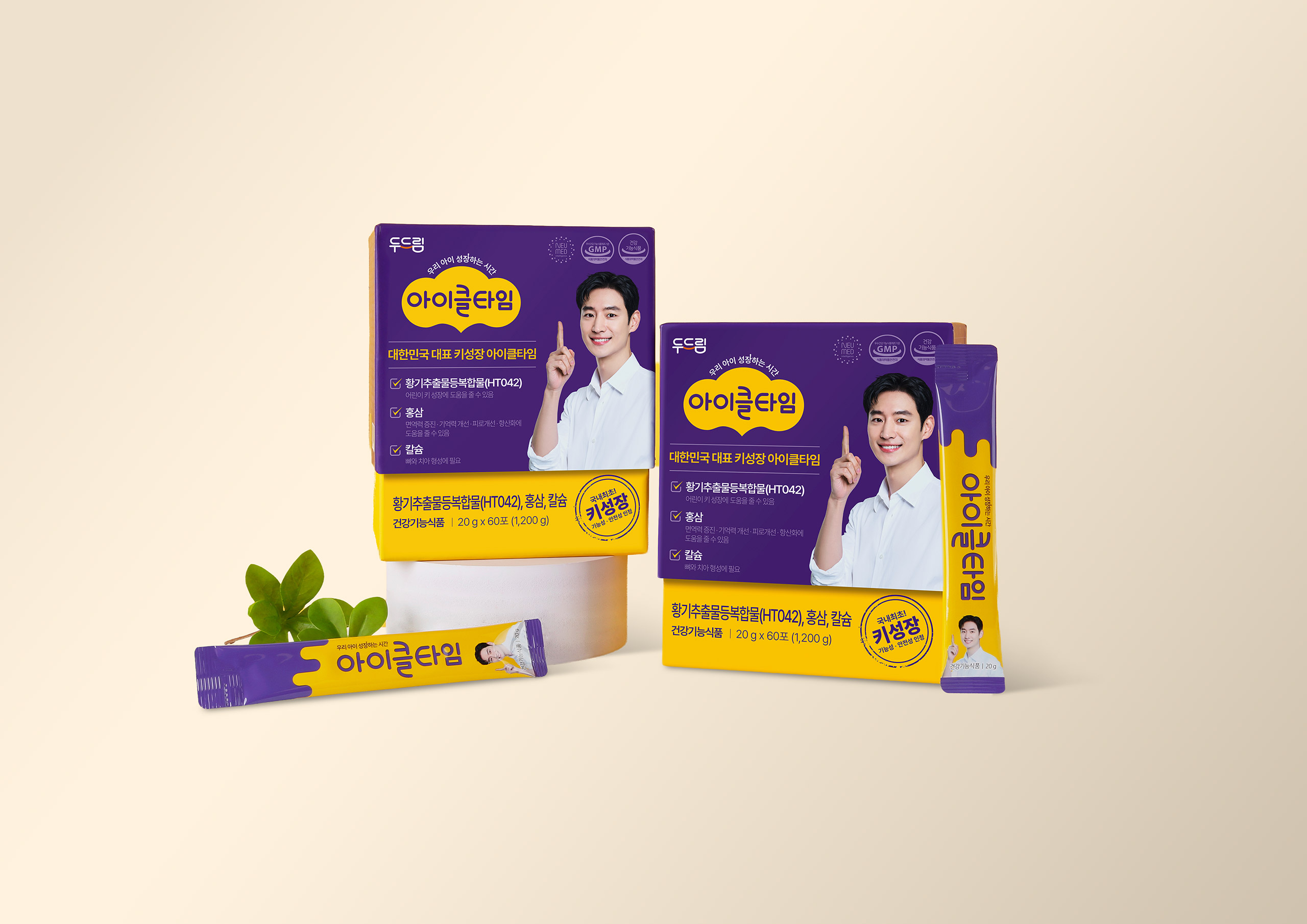 아이들의 무한한 가능성을 상징하는 딥 퍼플(Deep Purple)과 에너지 및 활력을 상징하는 선명한 옐로우(Vivid Yellow)의 보색 대비를 활용하여, 시각적 주목도를 높이는 동시에 브랜드가 지닌 강력한 성장 에너지를 시각화했습니다. 브랜드 로고를 곡선 형태로 배치해 부드러우면서도 아이들의 눈높이에 맞춘 친근하고 감각적인 디자인 톤앤매너를 완성했습니다. 언제 어디서나 간편하게 섭취할 수 있는 이지-컷(Easy-cut) 스틱 디자인에 패키지의 핵심 컬러와 패턴을 적용하여 사용 편의성을 높였으며, 단순한 건강기능식품을 넘어 아이들의 키 성장을 돕는 '성장 메이트'라는 감성적 가치를 디자인에 녹여냈습니다.