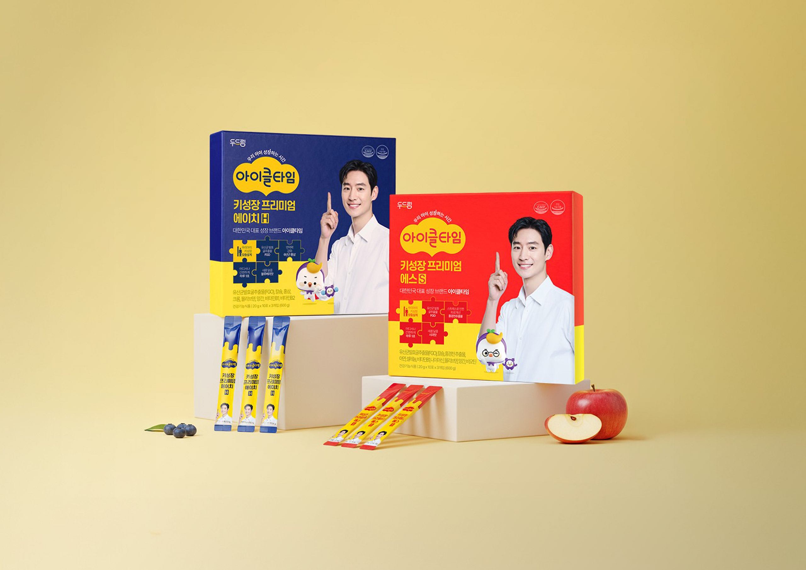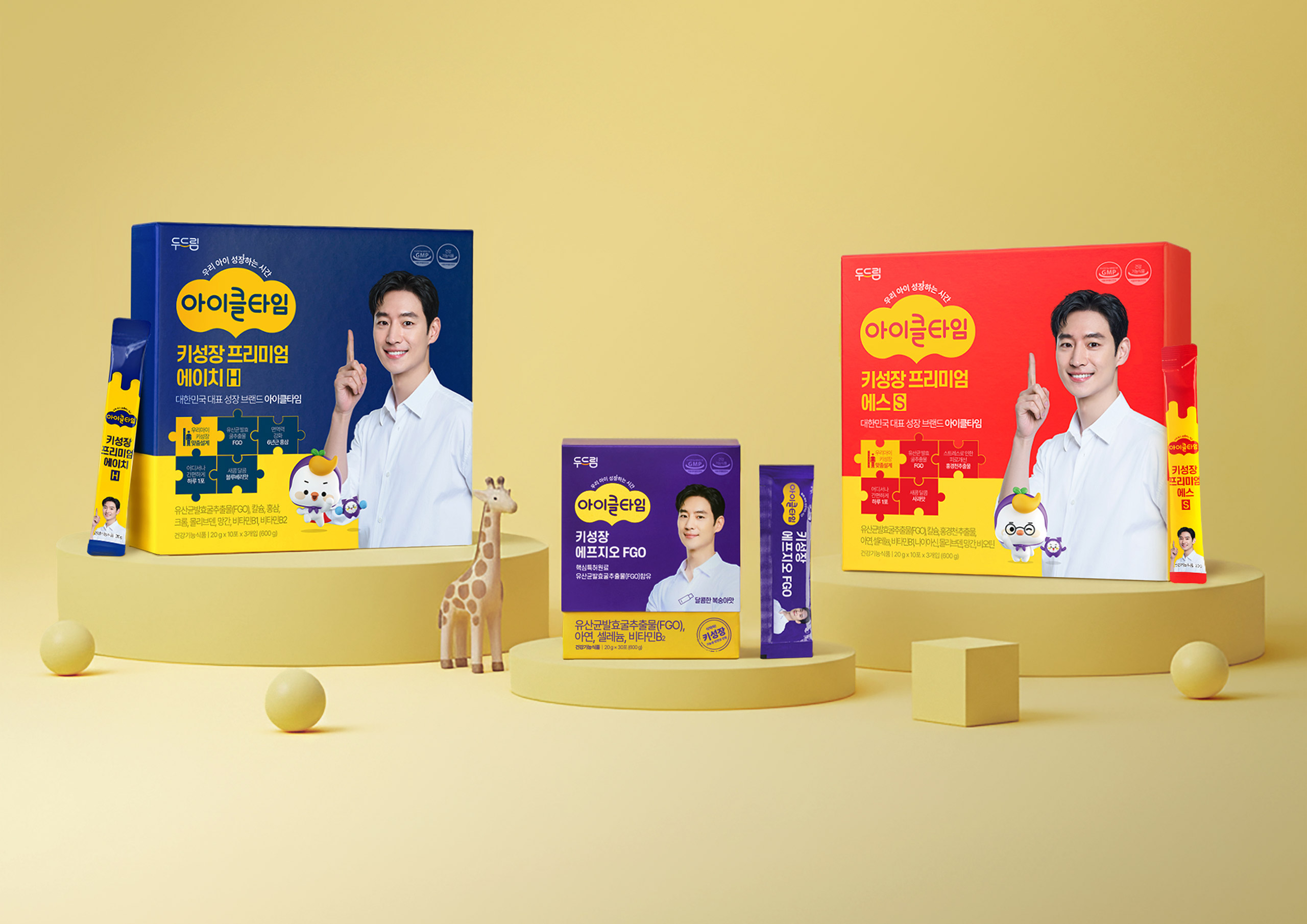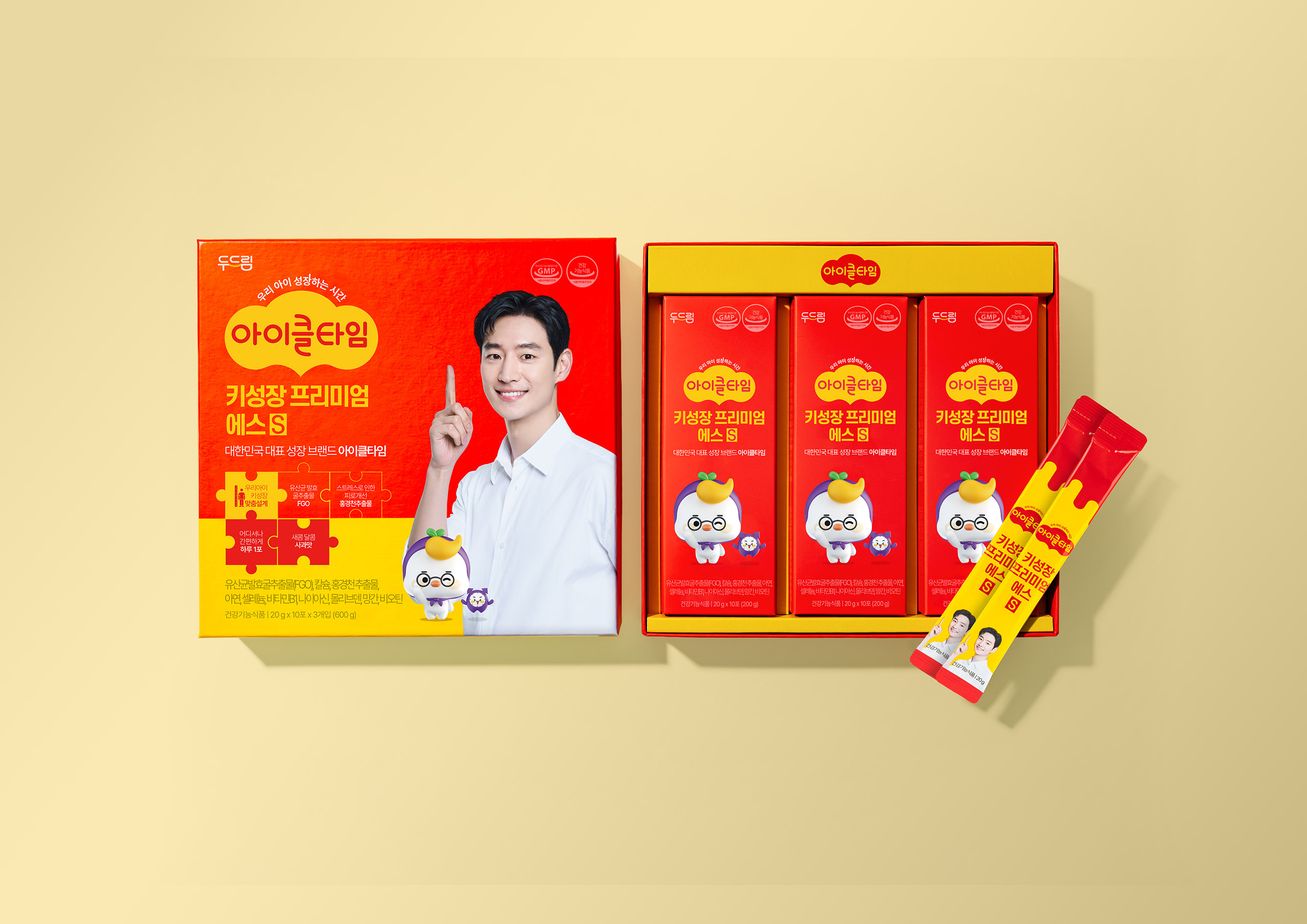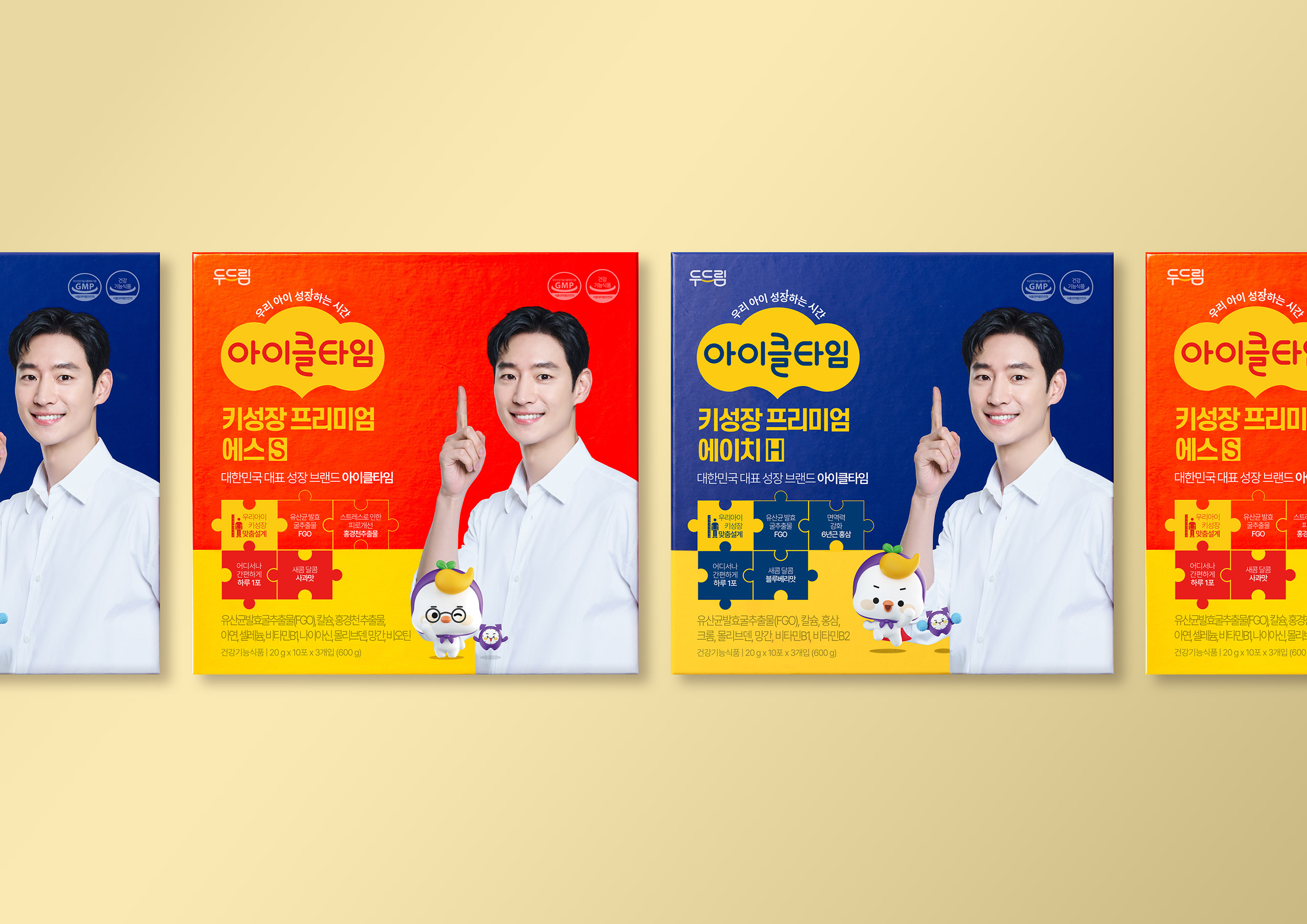 제품별 기능에 맞춰 블루, 레드, 퍼플 등 명확한 컬러 코딩 전략을 적용함으로써 아이클타임의 폭넓은 라인업을 체계화하고, 소비자가 필요한 솔루션을 한눈에 인지할 수 있도록 정보 구조를 최적화했습니다. 패키지 전면의 퍼즐 아이콘과 캐릭터 요소를 활용해 '성장을 위한 완벽한 결합'이라는 컨셉을 시각적으로 형상화하였으며, 이는 단순한 영양제를 넘어 아이들의 즐거운 성장 메이트라는 브랜드 스토리를 구축하는 핵심 요소가 됩니다. 일상 속 섭취 편의성을 고려한 스틱 파우치 디자인에도 브랜드 아이덴티티를 일관되게 적용하여, 기능성과 심미성이 결합된 사용자 중심의 토탈 브랜드 경험을 선사합니다.