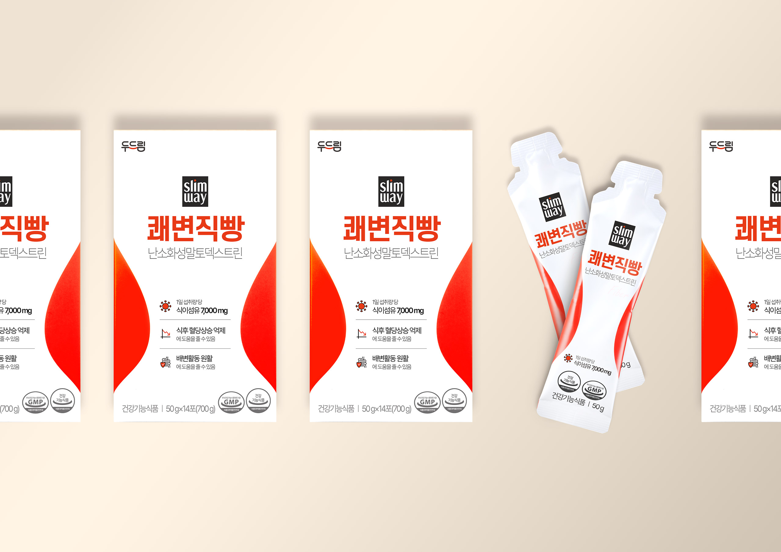 슬림웨이 라인업의 일관된 브랜드 시스템 안에서 '쾌변'이라는 제품의 특장점을 명확하게 하기 위해 역동적인 붉은 사선 그래픽을 핵심 요소로 설계했습니다. 건강한 원료(매실)를 연상시키는 그린 포인트와 레드의 보색 대비를 통해 생동감을 더했습니다. 제품의 기능인 장의 움직임이나 원활한 배출을 시각적으로 구현하기위해 시각적 리듬감으로 표현하여 소비자에게 기분 좋은 변화를 연상시키고, 브랜드에 대한 긍정적인 경험을 유도하는 스토리텔링형 디자인을 하였습니다.