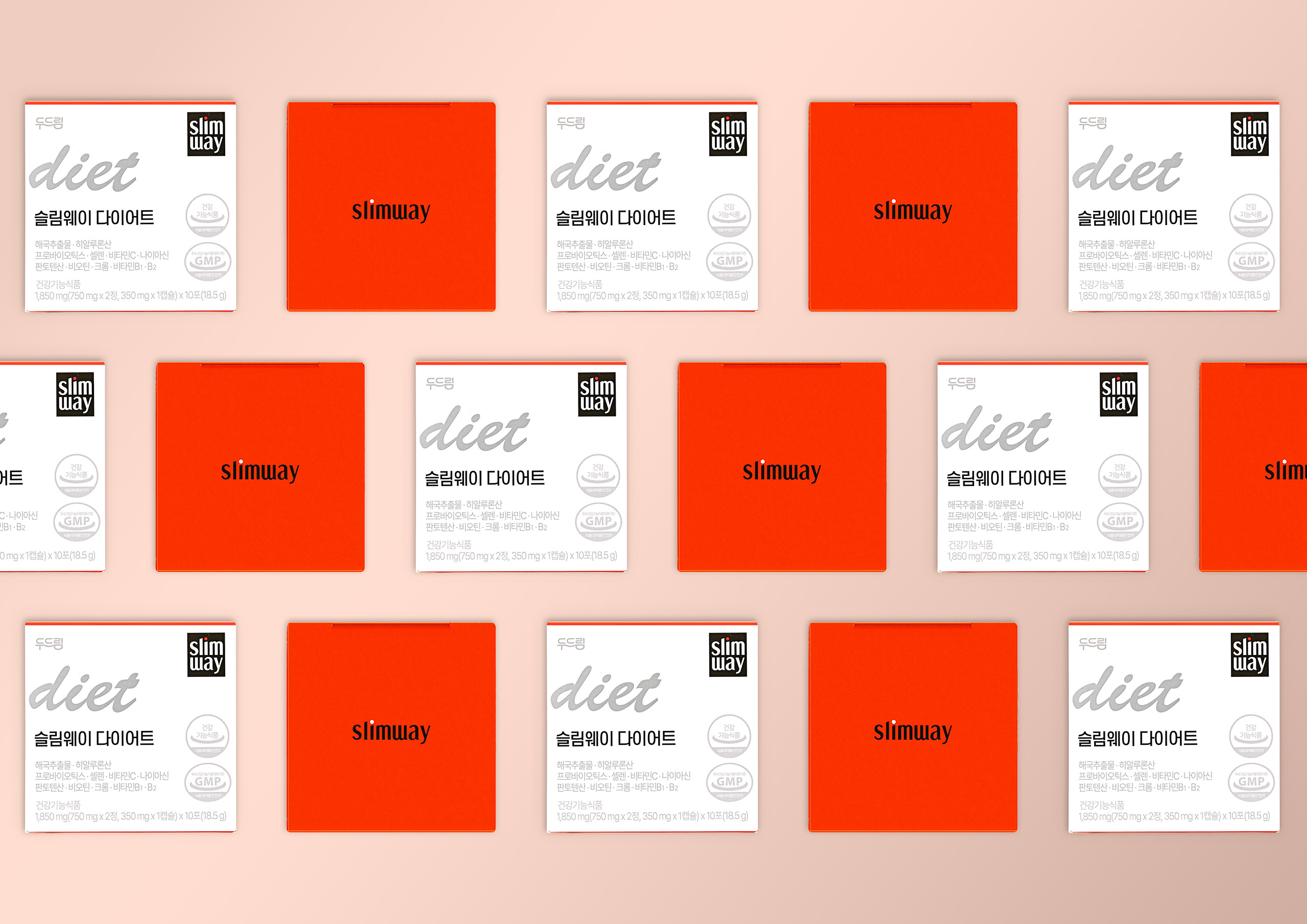 슬림웨이는 여성들이 ‘무리한 다이어트’보다 건강한 체중 관리에 관심을 가지기 시작한 시점에 맞춰 “꾸준히, 나답게”라는 메시지를 담고 탄생했습니다. 패키지는 책상 위나 가방 속에서도 ‘나를 챙기는 습관’으로 느껴지길 바라는 감성적 오브젝트로 디자인되었습니다. 다이어트 보조제의 심리적 장벽을 낮추고 세련된 라이프스타일 아이템으로 인식되도록 유도하는 감성 마케팅 관점의 패키지 디자인입니다.