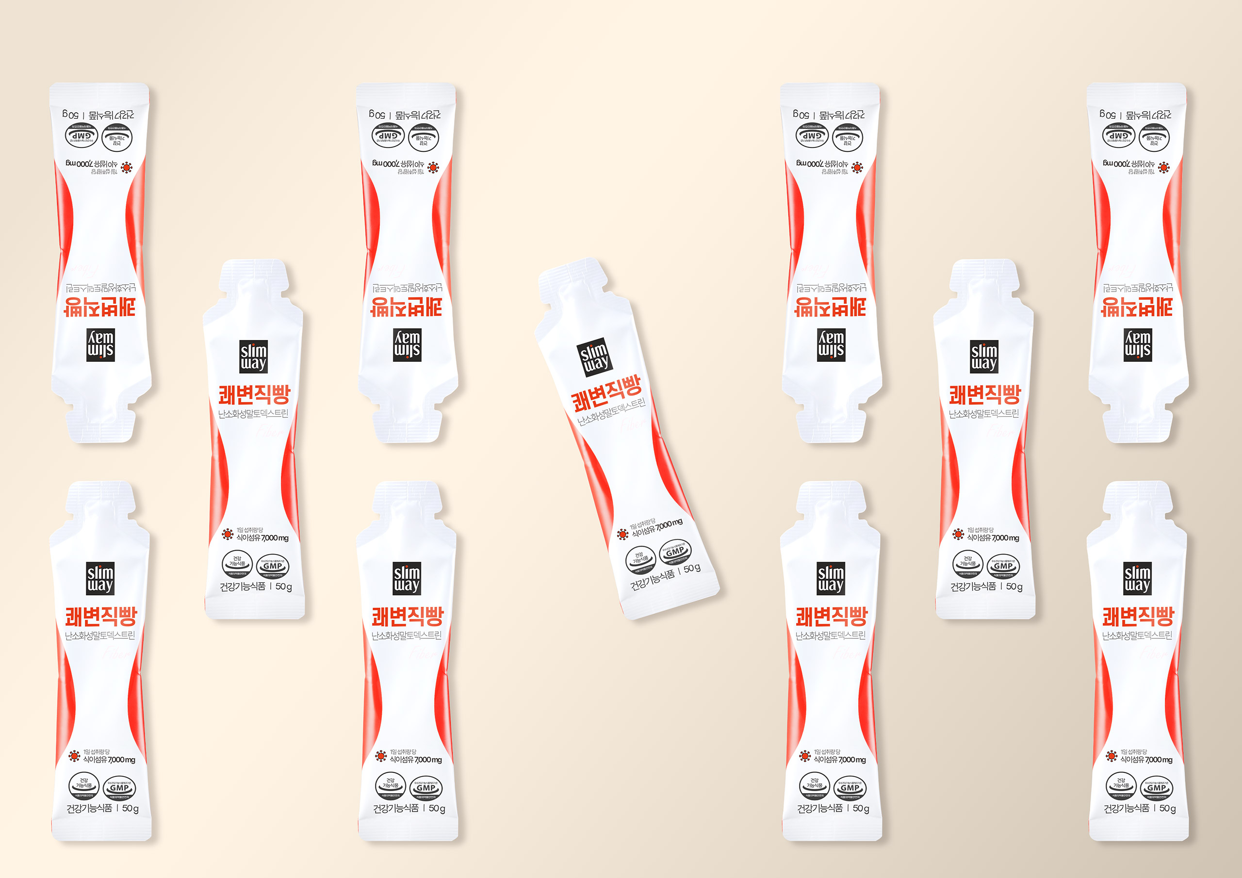 슬림웨이 라인업의 일관된 브랜드 시스템 안에서 '쾌변'이라는 제품의 특장점을 명확하게 하기 위해 역동적인 붉은 사선 그래픽을 핵심 요소로 설계했습니다. 건강한 원료(매실)를 연상시키는 그린 포인트와 레드의 보색 대비를 통해 생동감을 더했습니다. 제품의 기능인 장의 움직임이나 원활한 배출을 시각적으로 구현하기위해 시각적 리듬감으로 표현하여 소비자에게 기분 좋은 변화를 연상시키고, 브랜드에 대한 긍정적인 경험을 유도하는 스토리텔링형 디자인을 하였습니다.